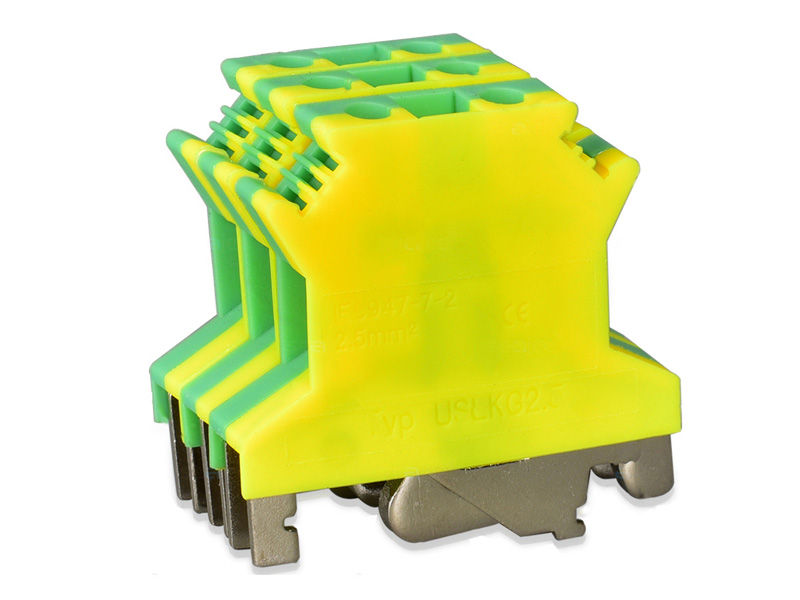 USLKG2.5黃綠接地端子采用全封閉式結構.取材全銅和防火等級94-V-2之尼龍66顏色為黃綠雙色設計.功能:將設備的電導入大地,可以有效的避免由于漏電而造成的事故.通常叫做黃綠接地端子